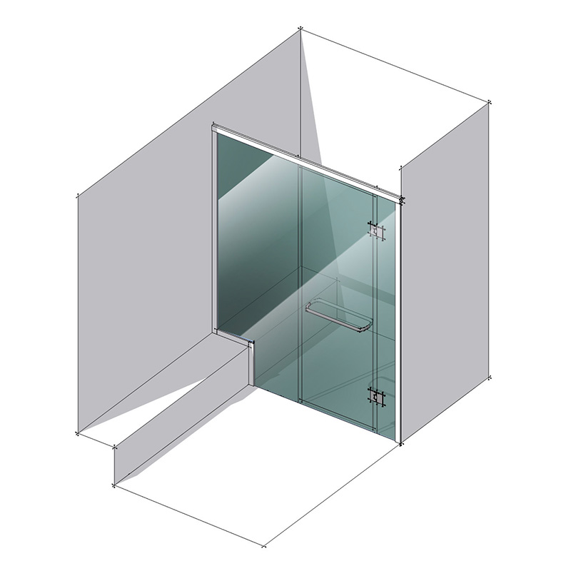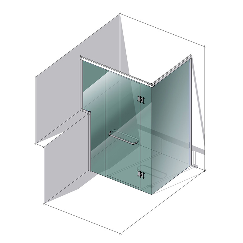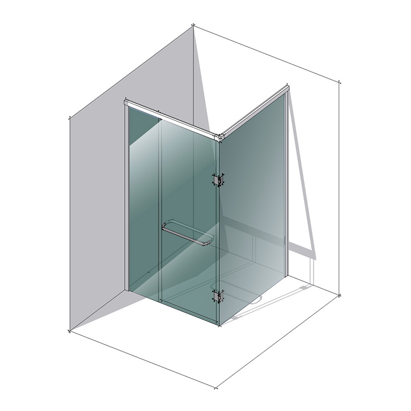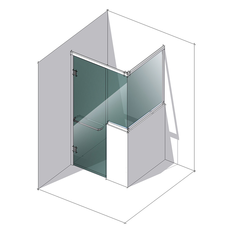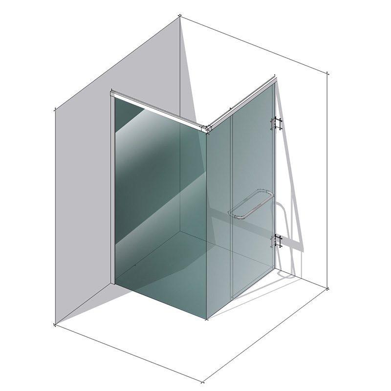 가장 전형적인 ㄱ자샤워부스의 형태이며 벽에 도어를 고정하고 픽스를 ㄱ자로 시공합니다.