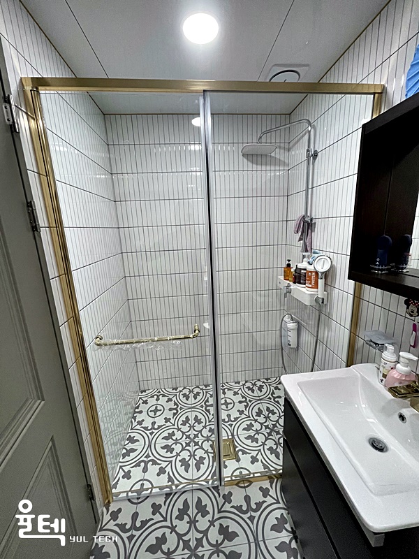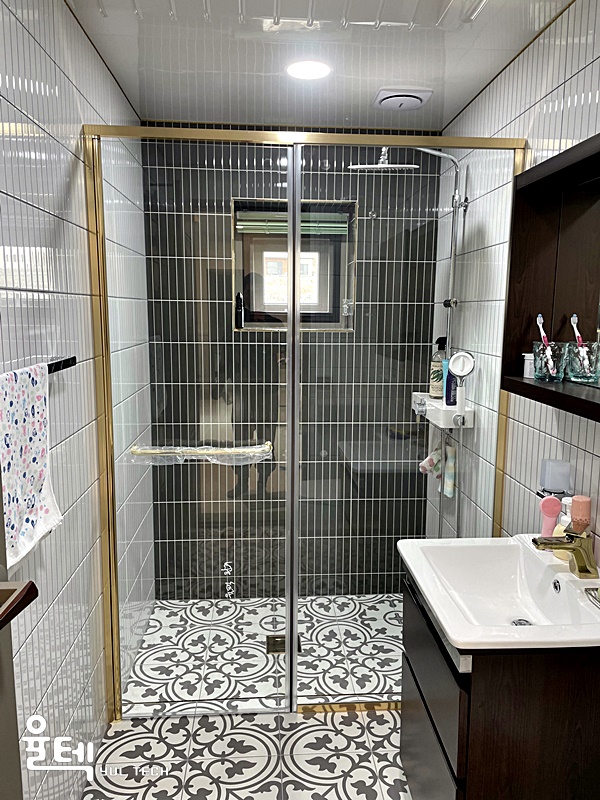 | 특징 | 샴페인골드 프레임과 안전한 접합유리가 적용된 샤워부스 |