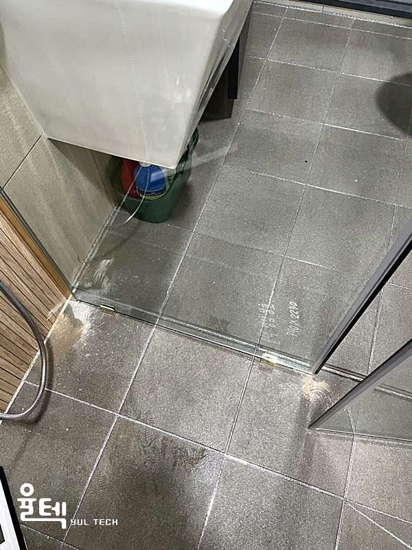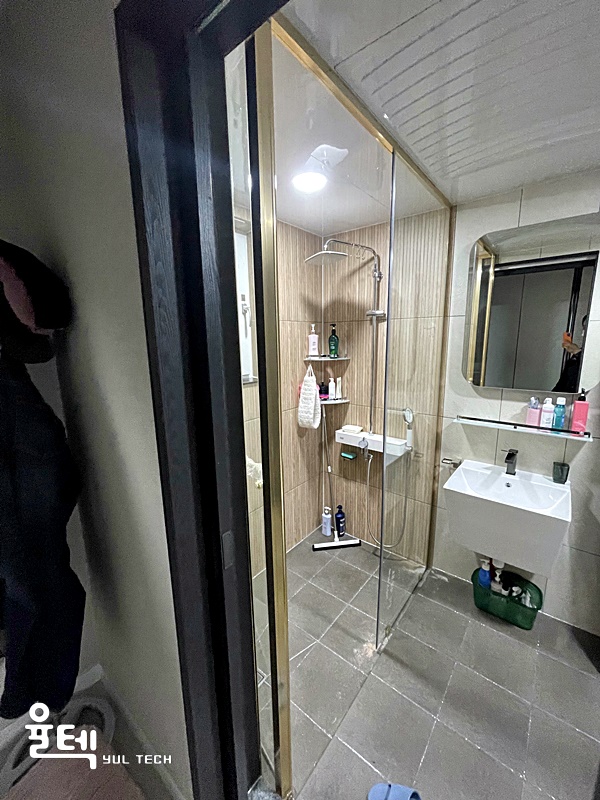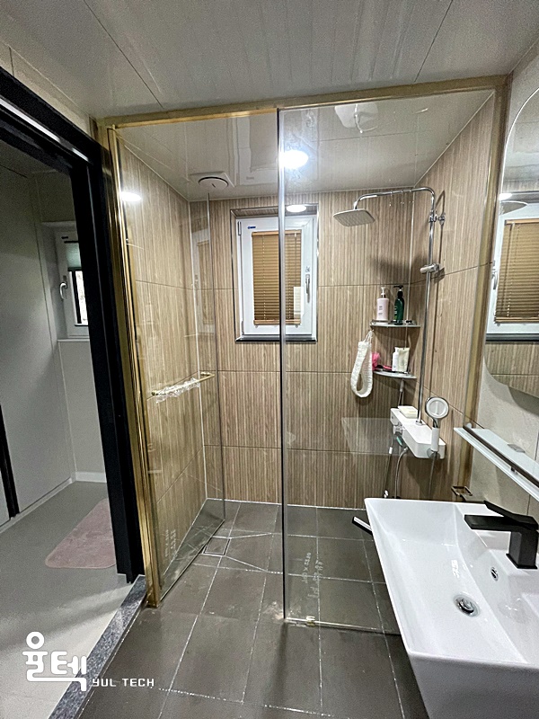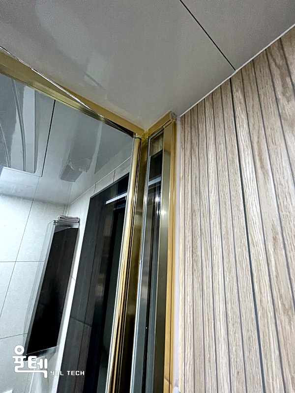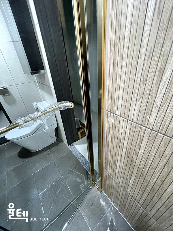 특징 샴페인골드 프레임과 접합유리가 적용된 ㄱ자 샤워부스