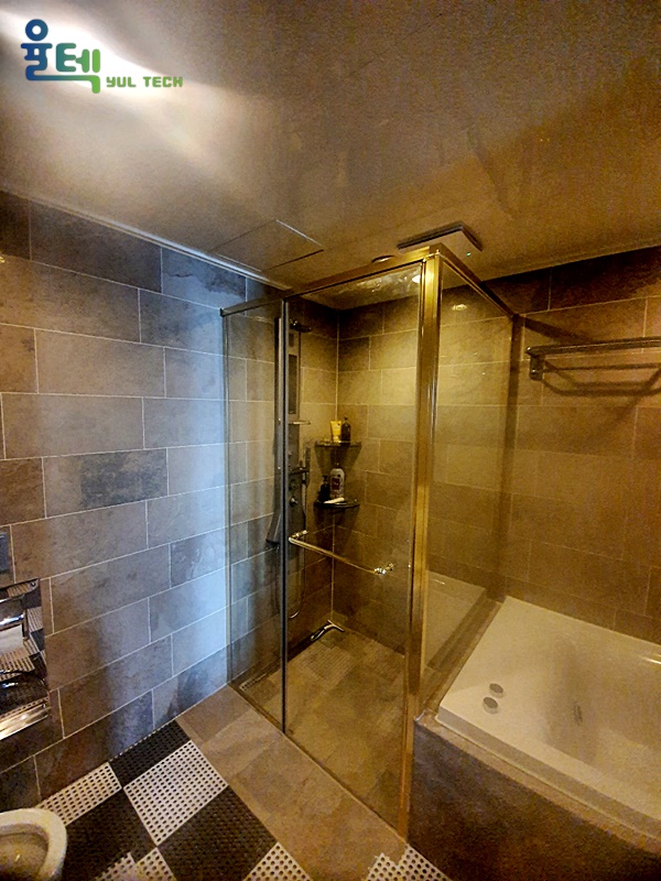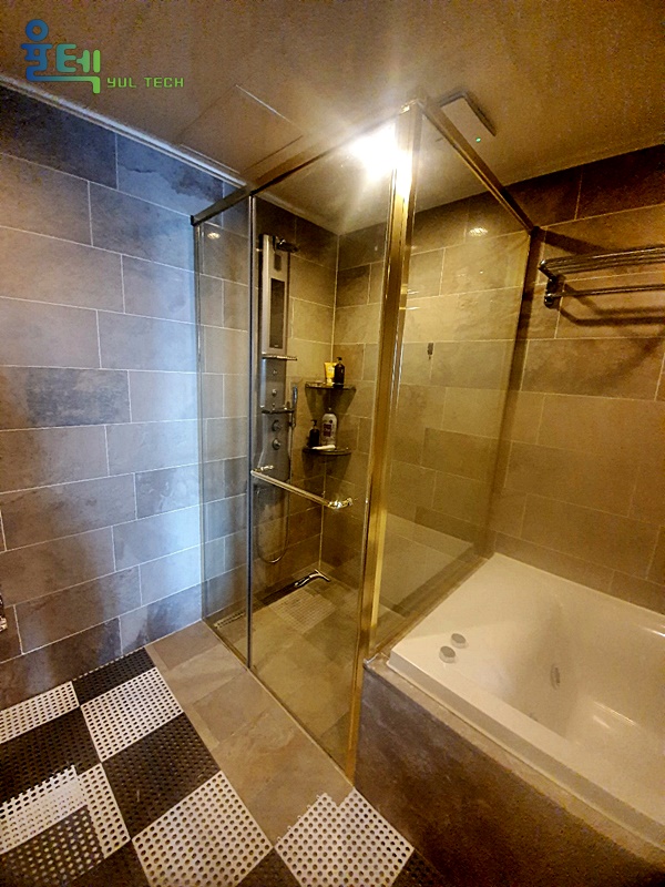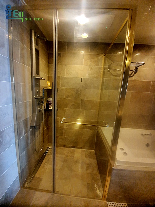 | 특징 | 샴페인골드 프레임과 접합유리가 적용된 욕조 결합형 샤워부스 |