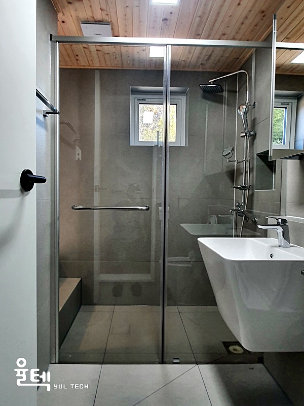 | 특징 | 화이트골드 무광 프레임과 접합유리가 적용된 샤워부스 |