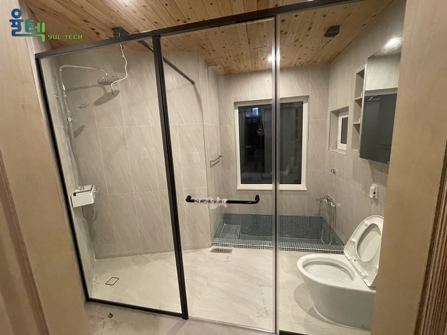 | 특징 | 흑니켈 프레임과 접합유리가 적용된 샤워부스 |