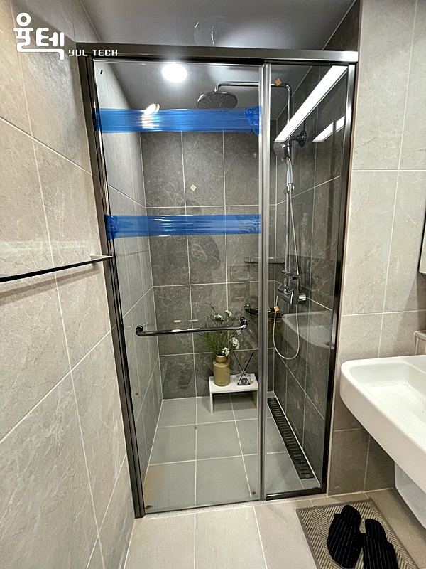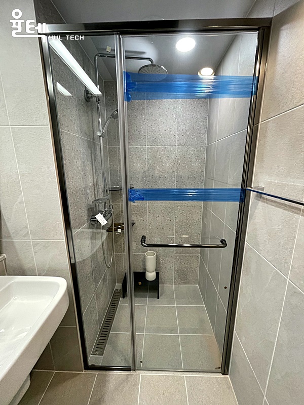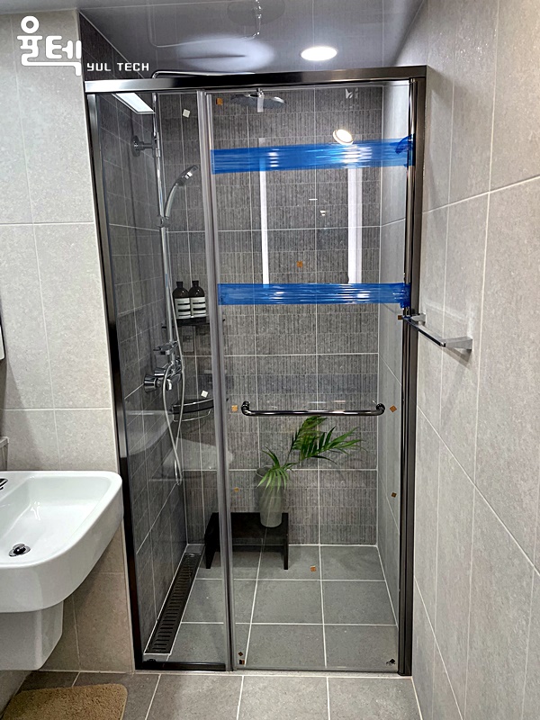 특징 티타늄그레이 프레임과 접합유리가 적용된 샤워부스