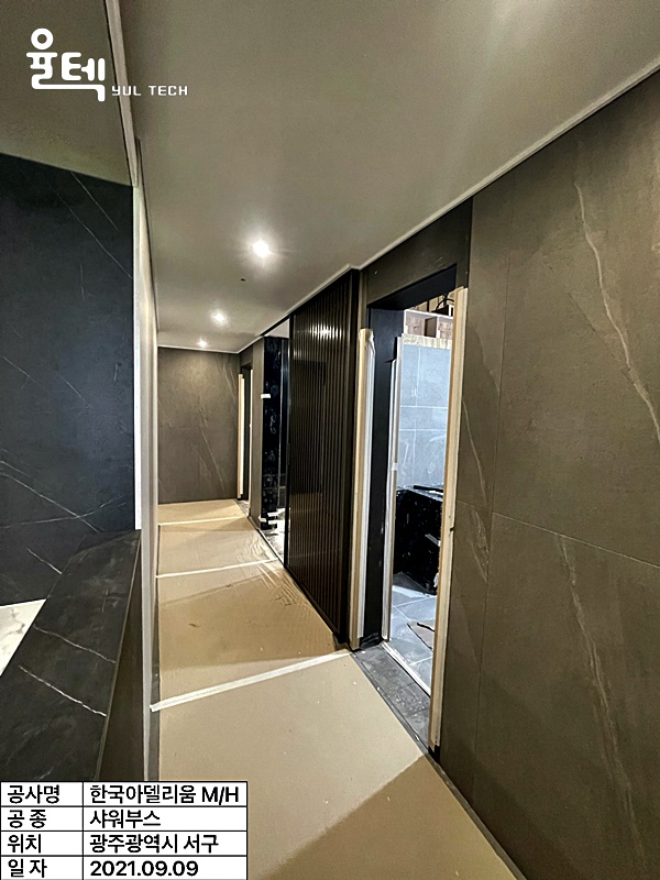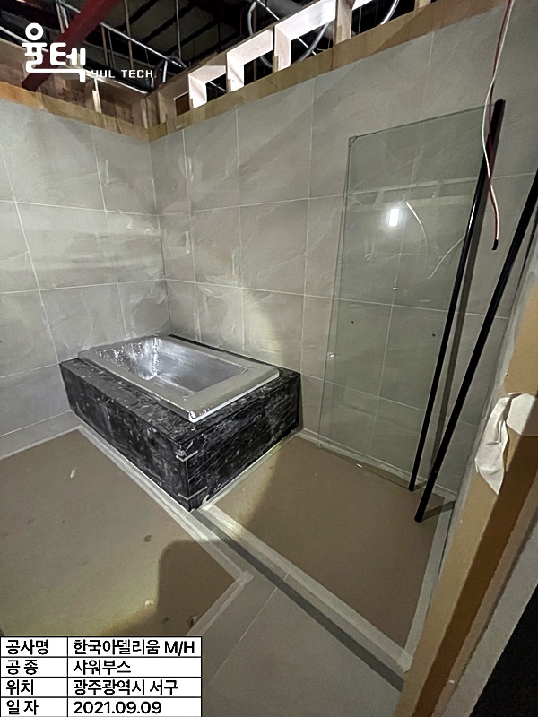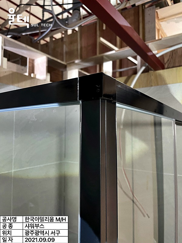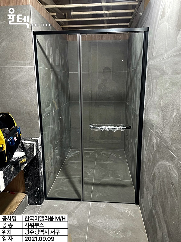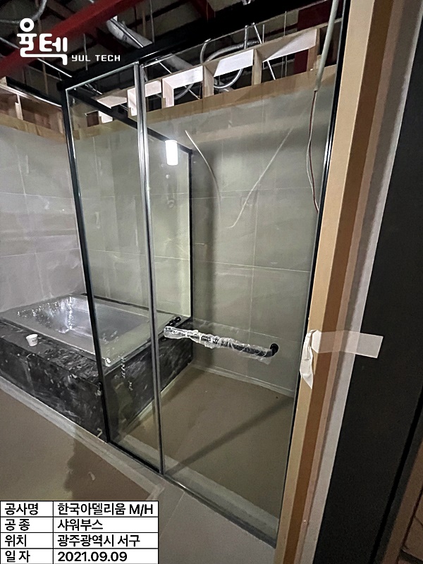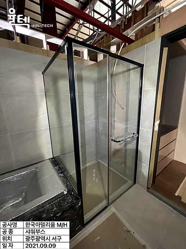 | 특징 | 접합유리와 흑니켈코팅 블랙 프레임이 적용된 일자 샤워부스와 욕조와 결합된 ㄱ자 샤워부스 |