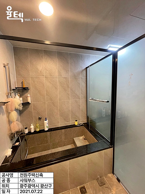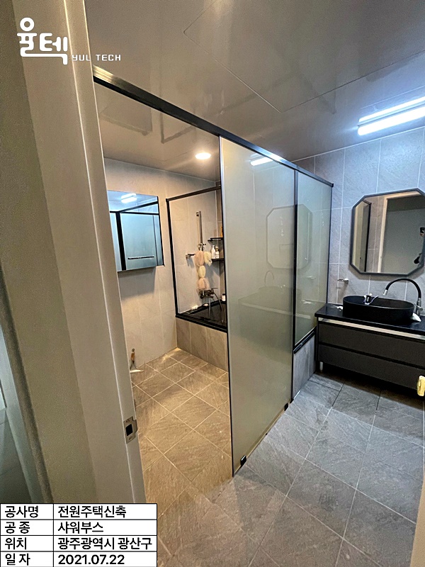 | 특징 | 샤워실 및 욕조와 세면대 변기 공간분리를 위한 2단 유리대유리 샤워부스와 욕조위 일자 샤워부스가 결합된 구조 |