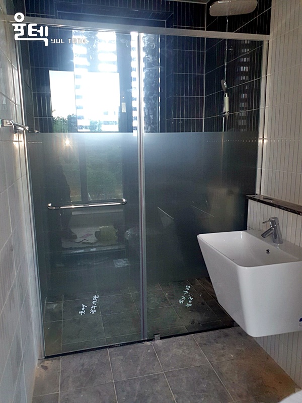 특징 접합유리에 에칭처리된 무힌지 도어방식 일자 샤워부스