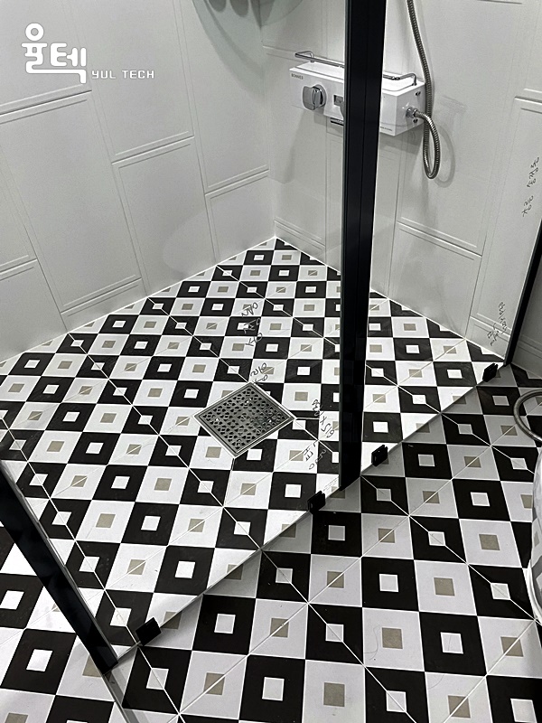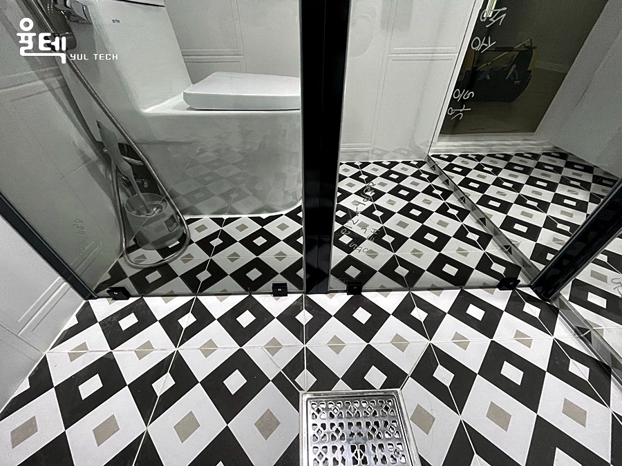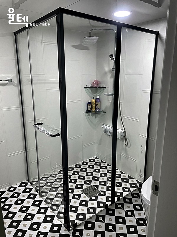 | 특징 | 안전한 접합유리와 흑니켈 코팅 블랙 프레임이 적용된 3픽스 1도어 ㄱ자 샤워부스 |