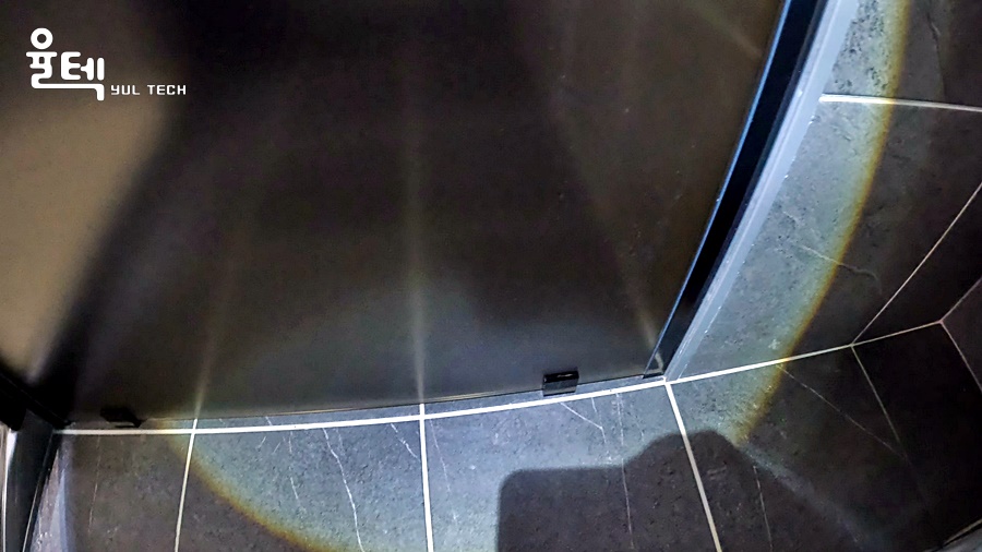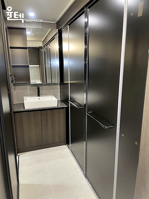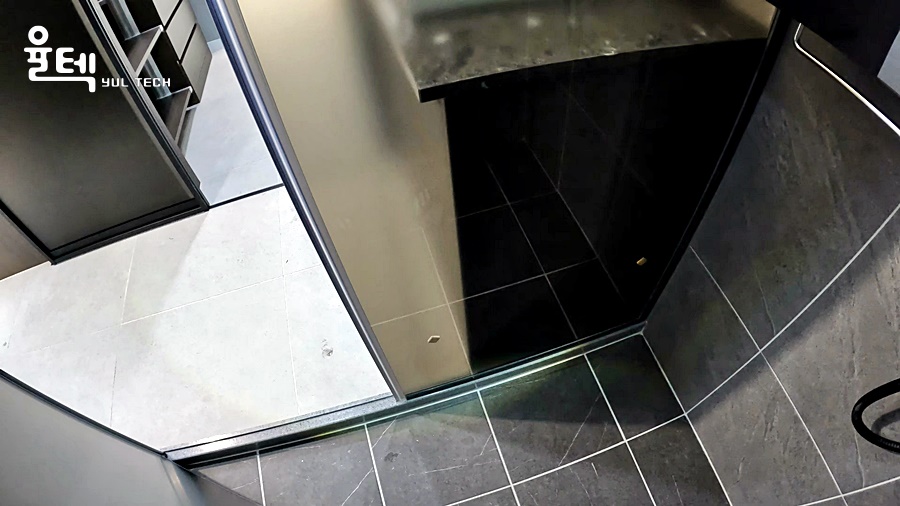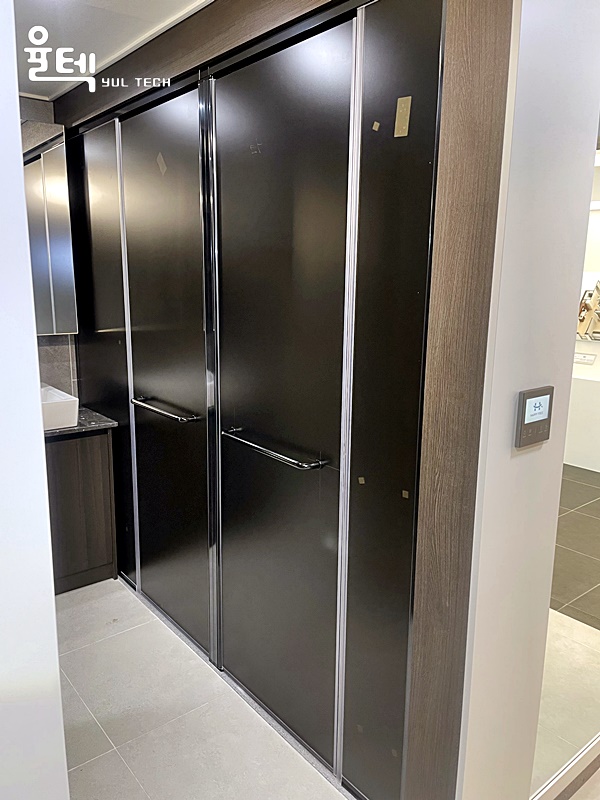 | 특징 | 블랙 프레임과 반투명 블랙에칭 처리된 강화유리가 적용된 T자형 샤워부스 유리문 |