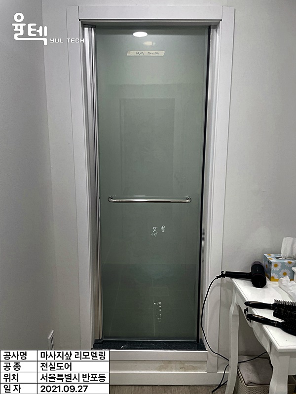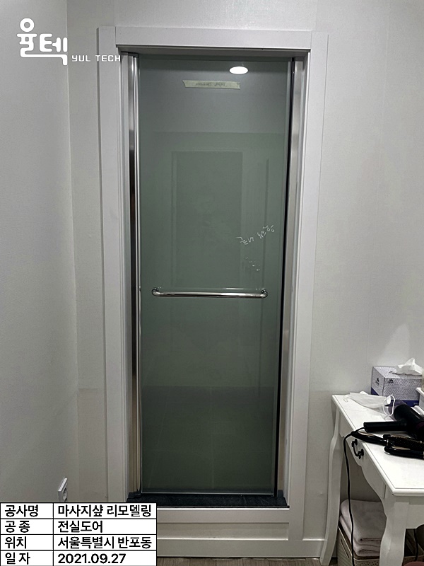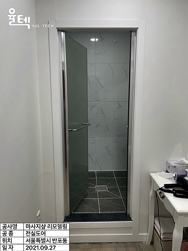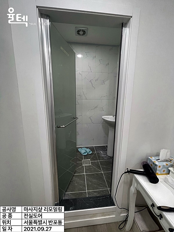 1 | 현장명 | 서울 반포 마사지샵 리모델링 욕실 입구 전실도어 유리문 설치 시공 |